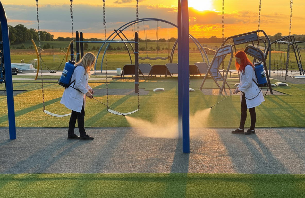 Safe play starts with a clean surface. Our PlaySafe Sanitizing Program uses eco-friendly, non-toxic products to eliminate bacteria, viruses, and odors on turf and rubber playground surfaces. Regular sanitizing helps reduce the spread of germs and keeps children healthier and happier year round.,